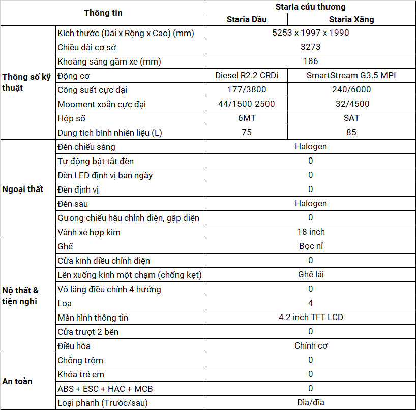Thông số kỹ thuật Hyundai Staria cứu thương: